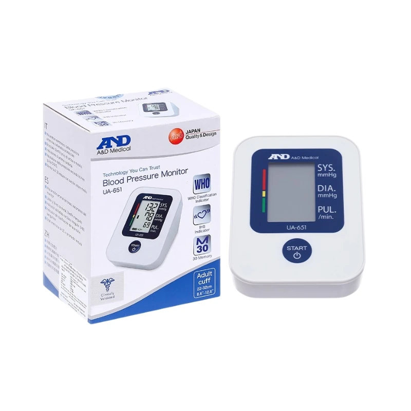 Máy Đo Huyết Áp Bắp Tay Tự Động AND UA-651 được sản xuất theo tiêu chuẩn Nhật Bản với các tính năng nổi bật như: Cảnh báo Nhịp tim không đều, cảnh báo huyết áp cao theo WHO, bộ nhớ lưu trữ đến 30 kết quả đo và hiển thị kết quả trung bình giữa các lần đo.